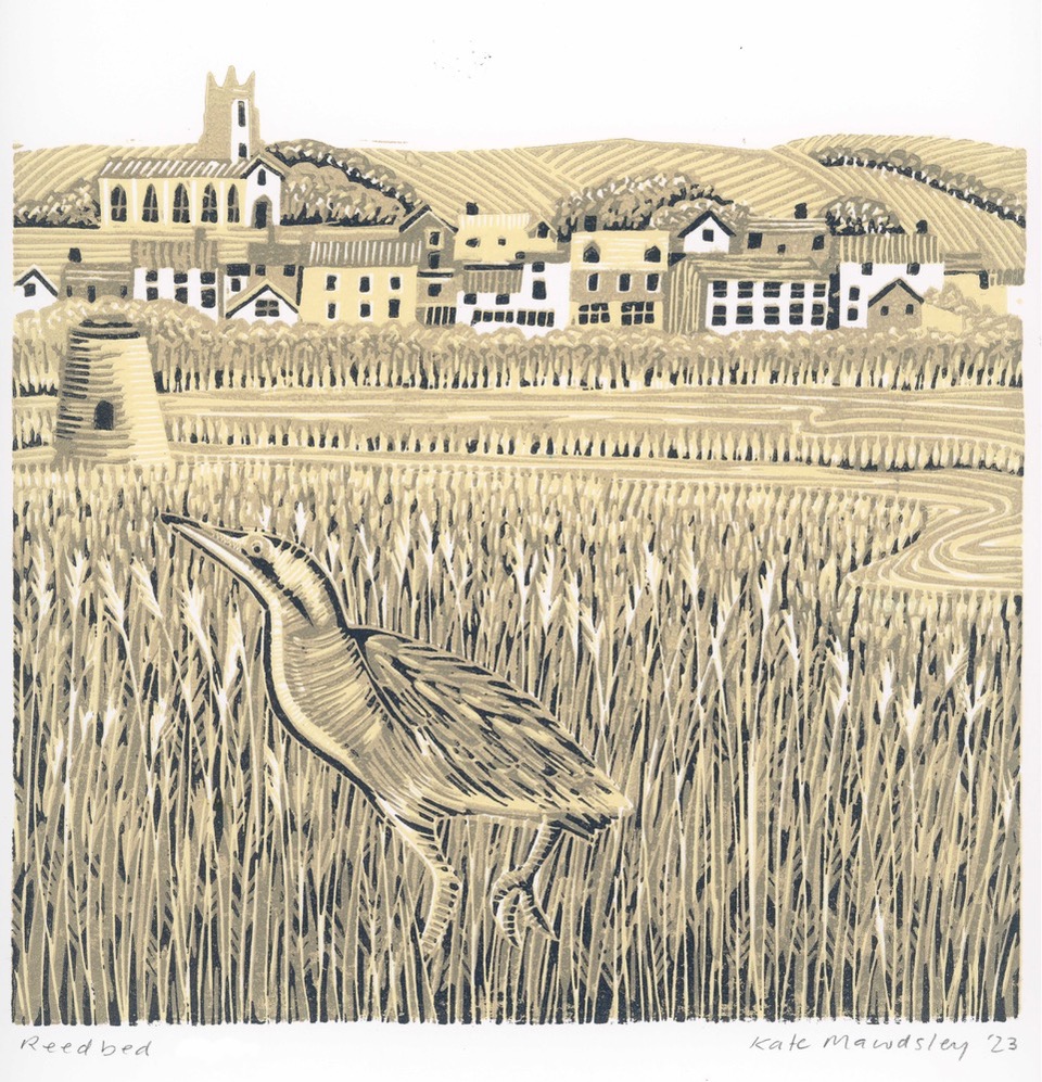 The seedbeds at Walberswick Suffolk with a Bittern so rarely seen, but often heard. Printed on Somerset paper using oil based inks.